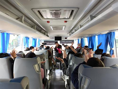 剛坐上大巴車的我們,已經(jīng)按捺不住內(nèi)心的激動,開起了不同風(fēng)格的個人演唱會,一路上歡聲笑語,歌聲不斷,還未到達(dá)目的地,就點燃了熱情活躍的氣氛。